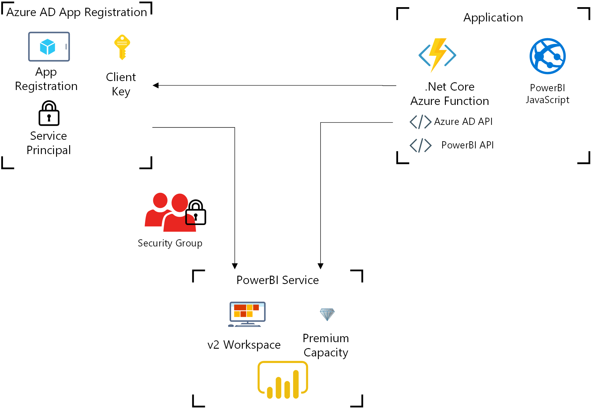 In our architecture, an Azure Function takes a report Id as a query string for a report that has been published to the workspace. The function outputs the 3 key items necessary for embedding a report via the PowerBI JavaScript library: report Id, report embed URL, and an embed access token.