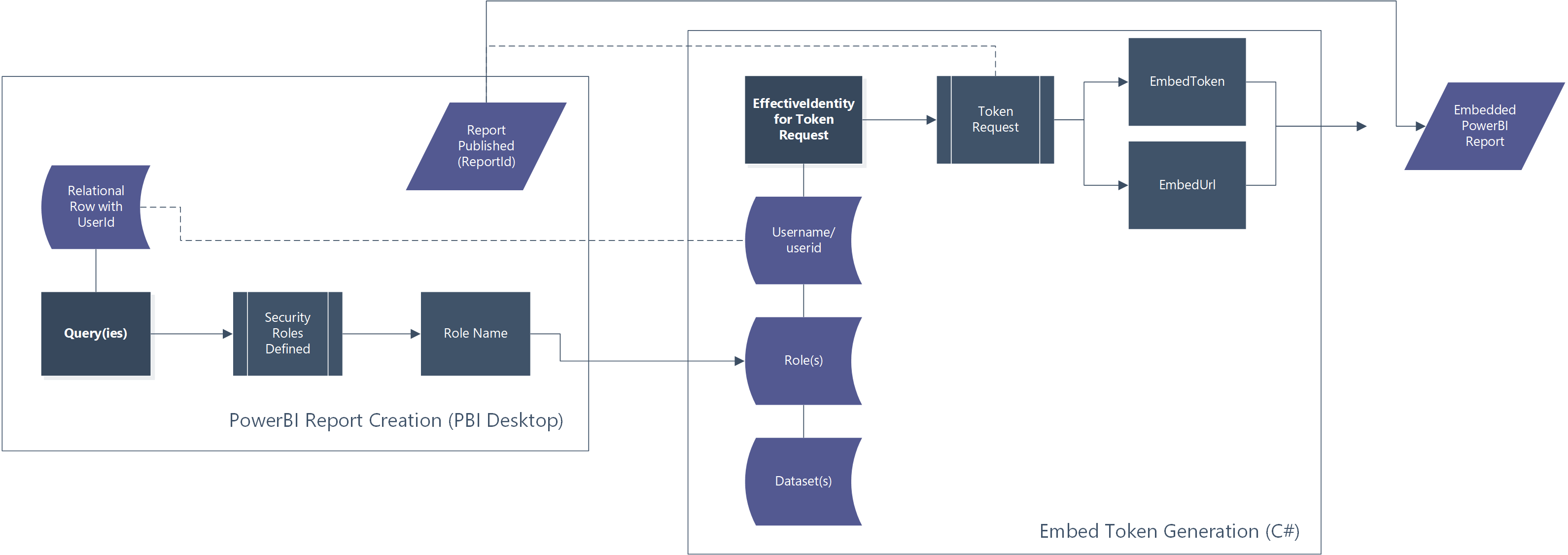 The application of RLS to PowerBI in an embedded scenario requires a 2-part change from the vanilla embed scenario. With the goal of embedding a report with row level security enforced, we must make changes to the embed token generation as well as to the report in PowerBI desktop.