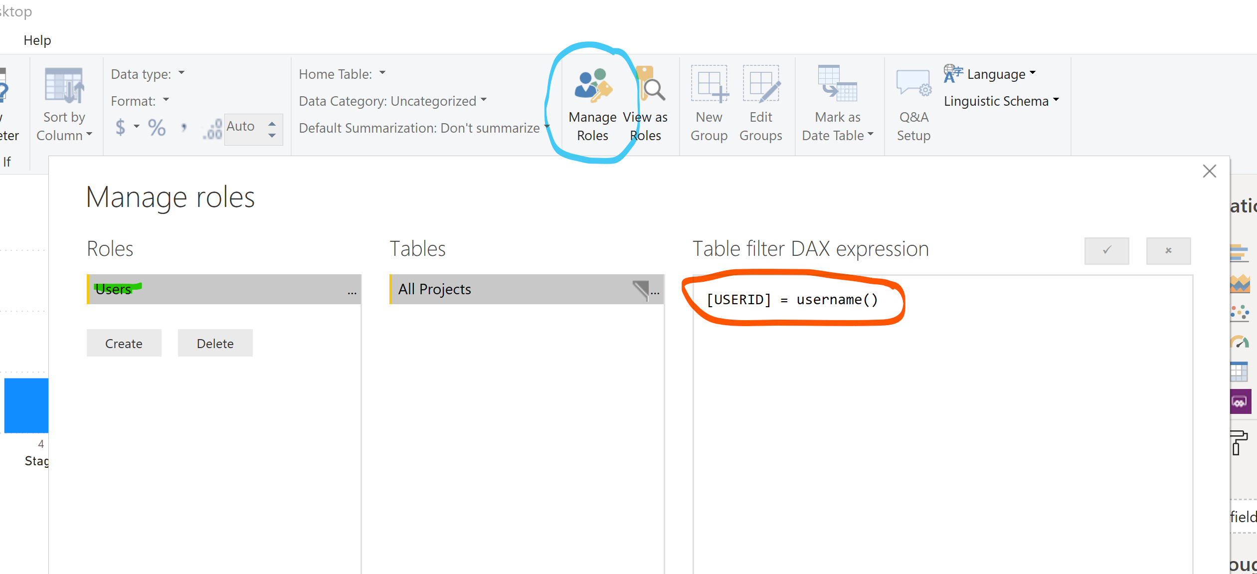 Back in the PowerBI report designer view under the Modeling tab, we find an option for Manage Roles. We are creating a single role called “Users” and it filters the single table in our dataset with the expression [USERID] = username(), that is the column USERID must equal the username.