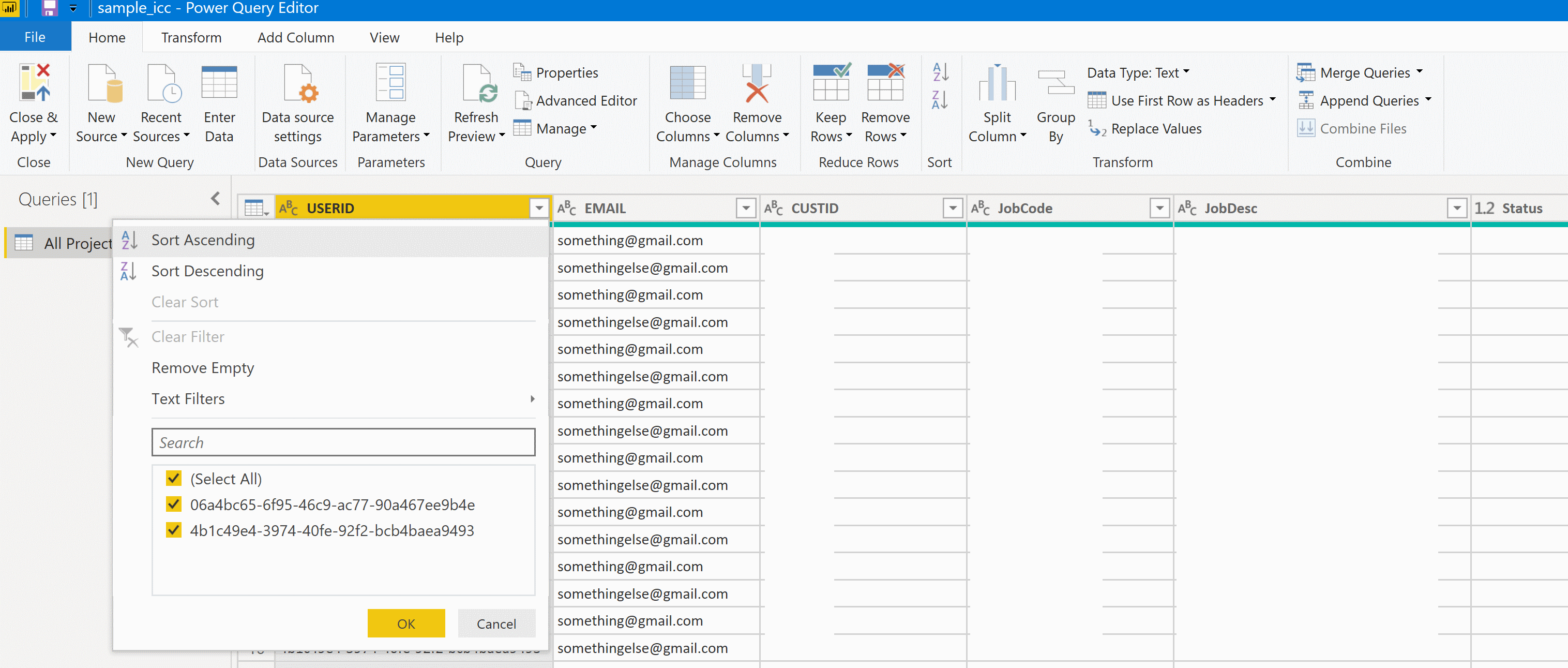 Without diving too far into the structure of your data, we’re going to play with a sample model so simple that it is a single table. This model fulfills the most important constraint for row level security – a field that can be used in a DAX expression to validate access by user or by role – in this case by including a single column for the user’s identifier.